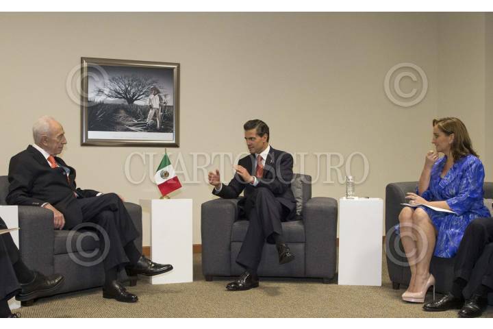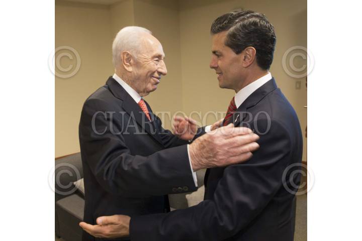 GUADALAJARA, JALISCO, 26OCTUBRE2015.- .- Al término de su participación en la 13ª Edición de México Cumbre de Negocios, el Presidente Enrique Peña Nieto sostuvo una reunión con Shimon Peres, exprimer Ministro de Israel y Premio Nobel de la Paz 1994. El Primer Mandatario estuvo acompañado por los Secretarios de Relaciones Exteriores y de Economía, Claudia Ruiz Massieu e Ildefonso Guajardo Villarreal, respectivamente, así como por el Presidente de México Cumbre de Negocios, Miguel Alemán Velasco. FOTO: PRESIDENCIA /CUARTOSCURO.COM