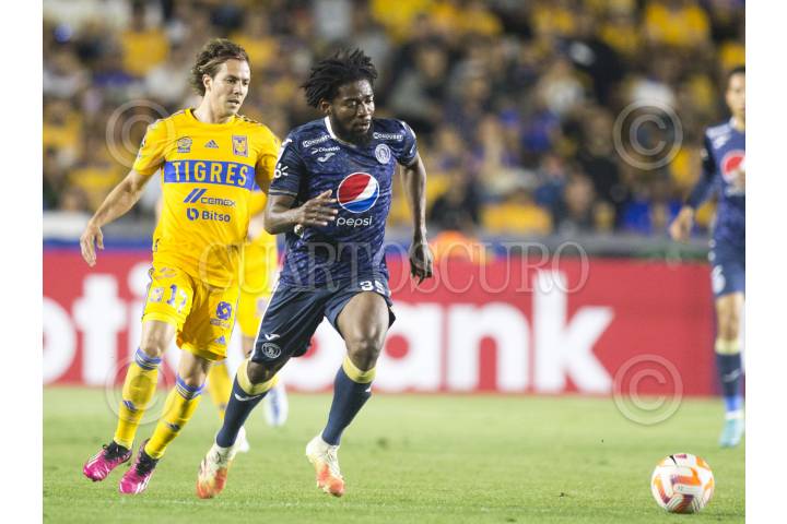 Sebastián Córdova de Tigres, se disputa el balón con Cristopher Meléndez del FC Montagua (HON), en el estadio Universitario, partido correspondiente a cuartos de final de la Concacaf Champions League.