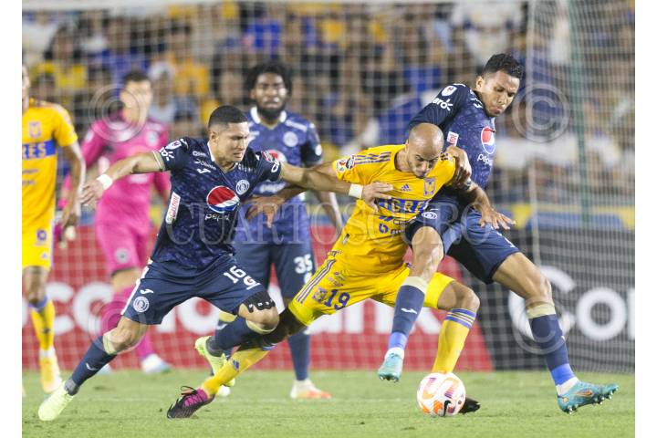 Guido Pizarro de Tigres, se disputa el balón con Héctor Castellanos del FC Montagua (HON), en el estadio Universitario, partido correspondiente a cuartos de final de la Concacaf Champions League.