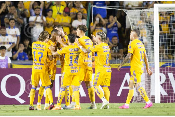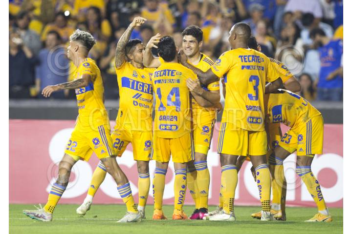 Jugadores de Tigres, festejan el gol ante el FC Montagua (HON), en el estadio Universitario, partido correspondiente a cuartos de final de la Concacaf Champions League.