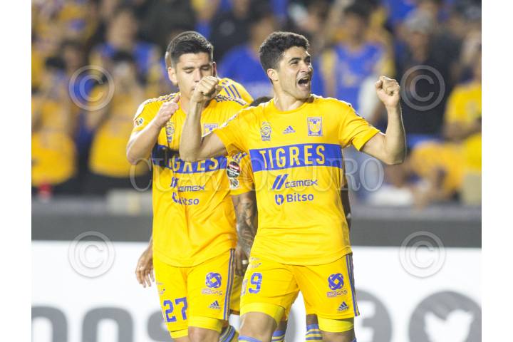 Nicolás Ibáñez de Tigres, festeja el gol ante el FC Montagua (HON), en el estadio Universitario, partido correspondiente a cuartos de final de la Concacaf Champions League.
