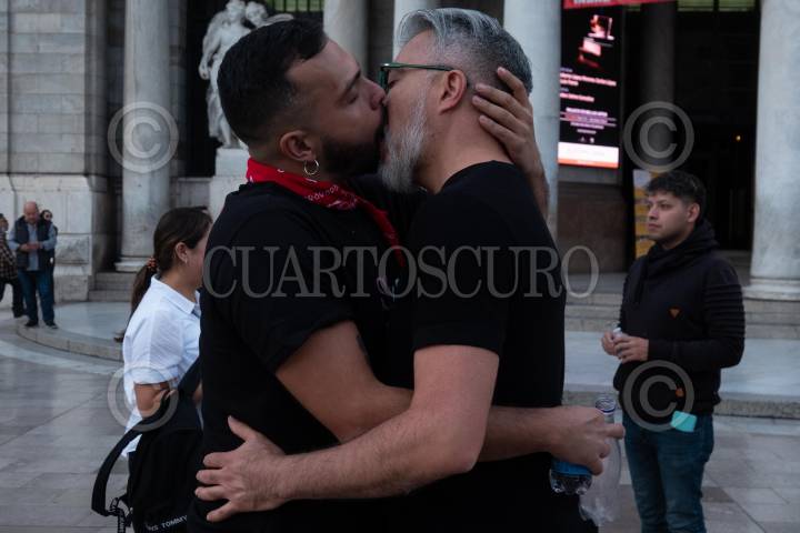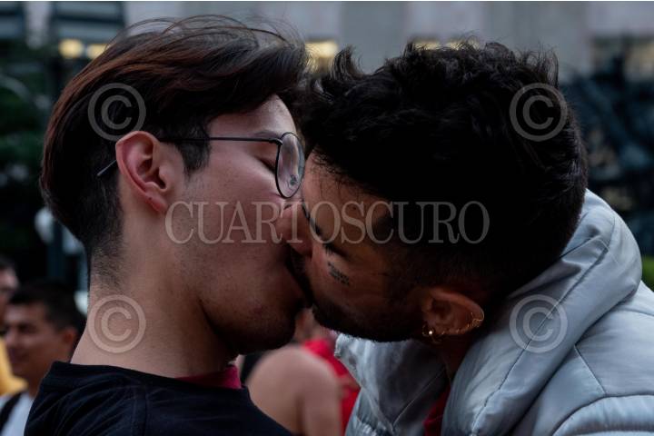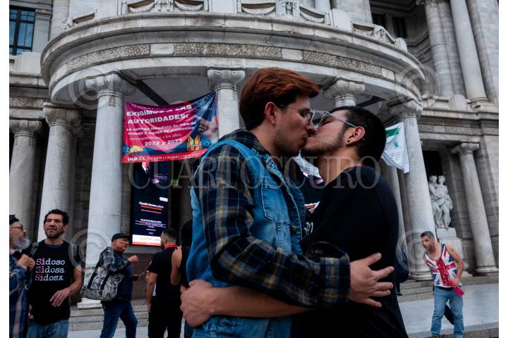 CIUDAD DE MÉXICO, 01DICIEMBRE2023.- Integrantes de la comunidad LGBTTTIQPA+ se manifestaron en el marco del Día Mundial de la Lucha contra el Sida con un Besotón frente al Palacio de Bellas Artes. FOTO: GALO CAÑAS/CUARTOSCURO.COM