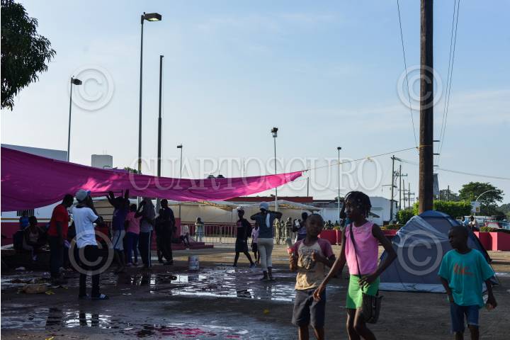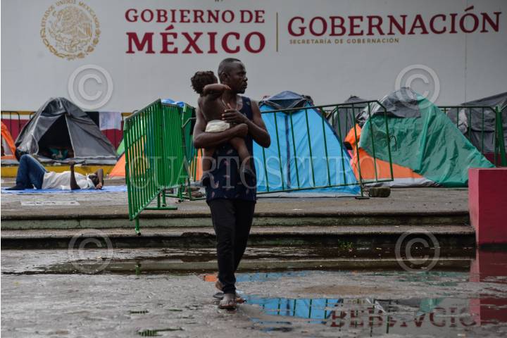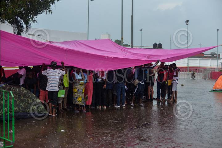TAPACHULA, CHIAPAS, 02SEPTIEMBRE2019.- Migrantes provenientes de diferente provincias africanas se resguardan de la lluvia y continuan a la expectativa de la atención por parte del Instituto Nacional de Migración, ya que mas de 800 migrantes realizaron un amparo para solicitar su libre transito por territorio mexicano, pero el INM respondió que los jueces federales que otorgaron el amparo no están facultados para estos resolutivos. FOTO: ISABEL MATEOS /CUARTOSCURO.COM