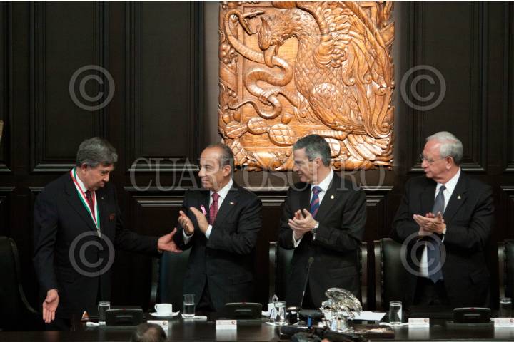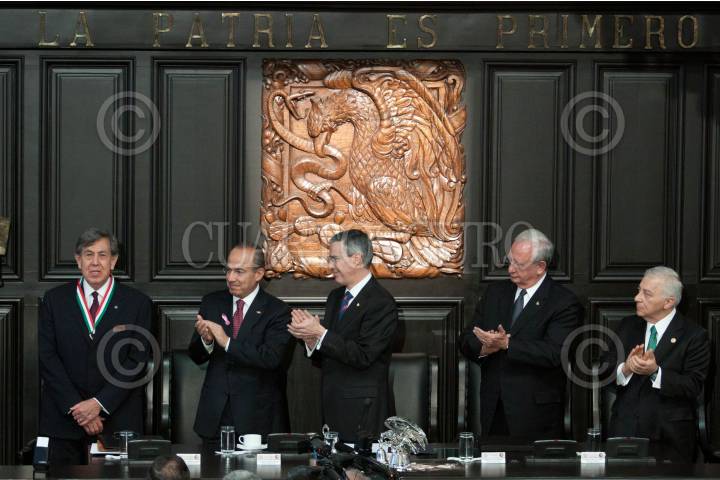 MÉXICO, D.F., 27OCTUBRE2011.- Cuauhtémoc Cárdenas Solorzano, recibió la medalla Belisario Domínguez en la antigua sede del Senado de la República. A la ceremonia asistieron Felipe Calderón Hinojosa, Presidente de México, José González Morfín, presidente de la mesa directiva de la Cámara Alta, Juan N. Silva Meza, presidente de la Suprema Corte de Justicia de la nación y Emilio Chuayffet, presidente de Cámara de Diputados. FOTO: MOISÉS PABLO/CUARTOSCURO.COM