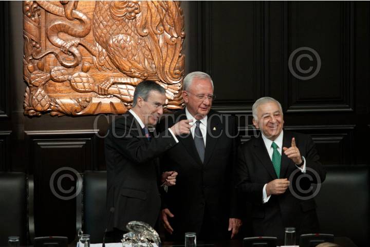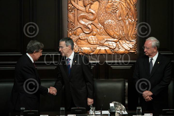 MÉXICO, D.F., 27OCTUBRE2011.- José González Morfín, presidente de la mesa directiva del Senado, Juan N. Silva Meza, presidente de Suprema Corte de Justicia de la Nación, y Emilio Chuayffet Chemor, presidente de la mesa directiva de la Cámara de Diputados, durante la ceremonia en la antigua sede del Senado en donde se realizó la sesión solemne en la que se entrego medalla Belisario Domínguez al Ingeniero Cuauhtémoc Cárdenas Solorzano. FOTO: MOISÉS PABLO/CUARTOSCURO.COM