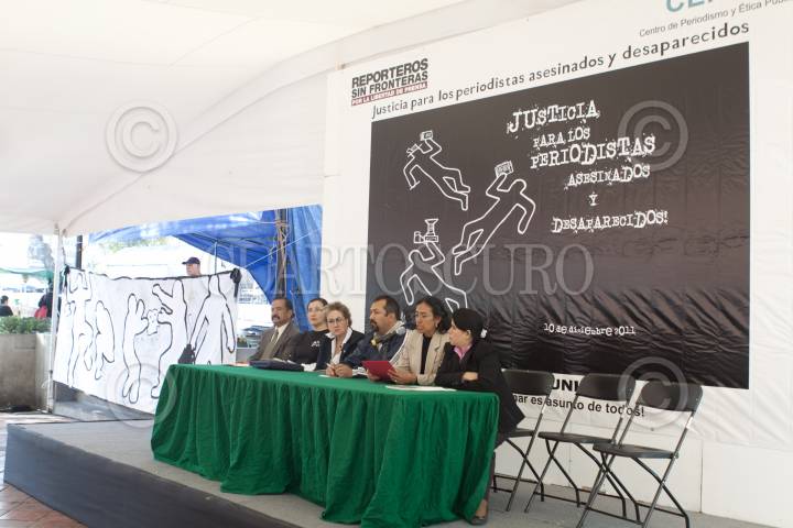 MÉXICO, D.F., 10DICIEMBRE2011.- Familiares de periodistas desaparecidos y periodistas ofrecieron una conferencia de prensa "Justicia para los Periodistas Asesinados y Desaparecidos" organizado por Reporteros Sin Fronteras, en la plaza Francisco Zarco. En la imagen David Silva, Miriam Daisy Cruz, Blanca Martínez, Jesús Lemus y Maria Dolores Barajas. FOTO: MOISÉS PABLO/CUARTOSCURO.COM