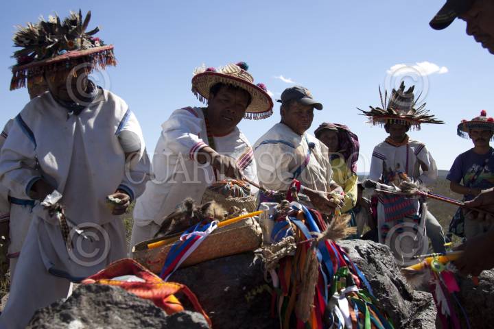 WIRIKUTA, SAN LUIS POTOSÍ, 19MARZO2012.- Los wixaricas creen que en Wirikuta salió por vez primera el sol y habitan las deidades y espíritus ancestrales, por tanto, consideran que cada elemento natural que habita en Wirikuta es igualmente sagrado. Uno de los ritos más sagrados es la peregrinación a Wirikuta. Entre los meses de octubre y marzo, se recrea el caminar de los deidades desde el mar en Haramara (diosa del mar), al este, hasta el lugar en donde salió el sol (Reunax), el actual Cerro Quemado (Leunaxü). A pesar de ello, la Secretaría de Economía otorgó 22 concesiones mineras a la empresa canadiense First Majestic Silver para la explotación de plata en Wirikuta. La compañía construirá en ese territorio una carretera para sacar su producción. El proyecto tendrá consecuencias devastadoras para el pueblo wixárika y para el medio ambiente. Los permisos de operación provocarán la contaminación de los ríos, el acuífero, la tierra y el aire. Amenazan la supervivencia de especies endémicas y en peligro de extinción, como el águila real. FOTO: IVÁN STEPHENS /CUARTOSCURO.COM