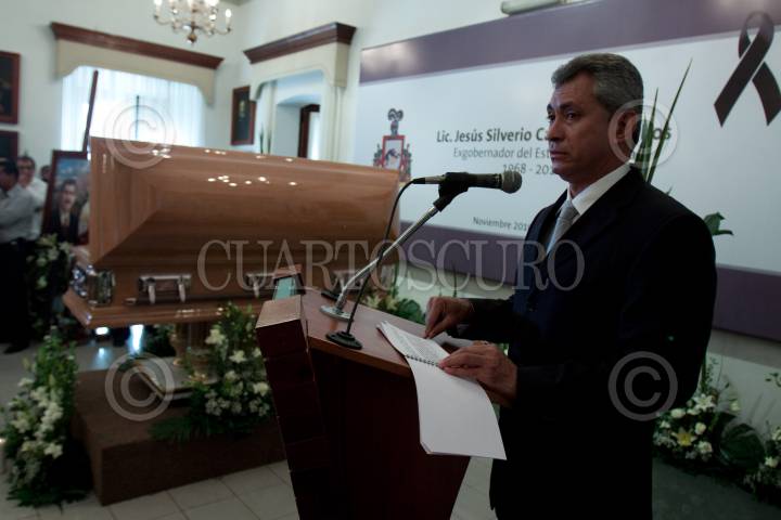 COLIMA, COLIMA, 22NOVIEMBRE2010.- Mario Anguiano, gobernador del estado dio un mensaje durante el homenaje de cuerpo presente que recibió el ex mandatario Silverio Cavazos Ceballos (1968-2010) en el Palacio de Gobierno. El ex gobernador fue asesinado el día de ayer de tres disparos de arma de fuego frente a su casa. FOTO: MISAEL VALTIERRA/CUARTOSCURO.COM