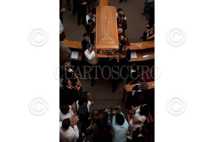 TECOMAN, COLIMA, 22NOVIEMBRE2010.- El féretro de Silverio Cavazos Ceballos (1968-2010) sale del Templo de Santo Santiago Apóstol ubicado en este municipio después de realizarle una misa. a quien fuera gobernador del estado. Silverio Cavazos fue asesinado el día de ayer por tres disparos de arma de fuego afuera de su casa. FOTO: MISAEL VALTIERRA/CUARTOSCURO.COM