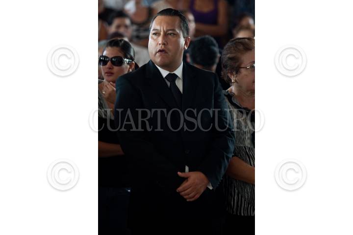 TECOMAN, COLIMA, 22NOVIEMBRE2010.- Mario Anguiano, gobernador del estado, Idalia González Pimentel, viuda de Cavazos y Francisco Blake Mora, secretario de Gobernación, quien asistió en representación del presidente de México, Felipe Calderón Hinojosa, durante la misa al ex mandatario Silverio Cavazos Ceballos (1968-2010) que se ofreció en el Templo de Santo Santiago Apóstol ubicado en este municipio. El ex gobernador fue asesinado el día de ayer por tres disparos de arma de fuego afuera de su casa. FOTO: MISAEL VALTIERRA/CUARTOSCURO.COM