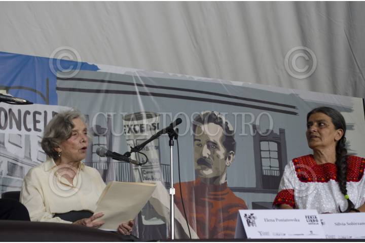 MÉXICO, D.F., 19OCTUBRE2012.- La escritora Elena Poniatowska y Silvia Solórzano durante su participación en el Foro Carlos Fuentes de la XII Feria del Libro del Zócalo. FOTO: SANDRA PÉREZ /CUARTOSCURO.COM