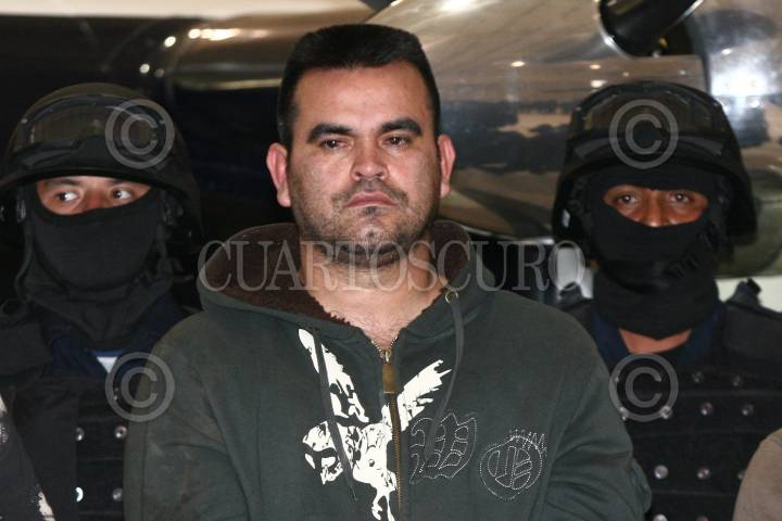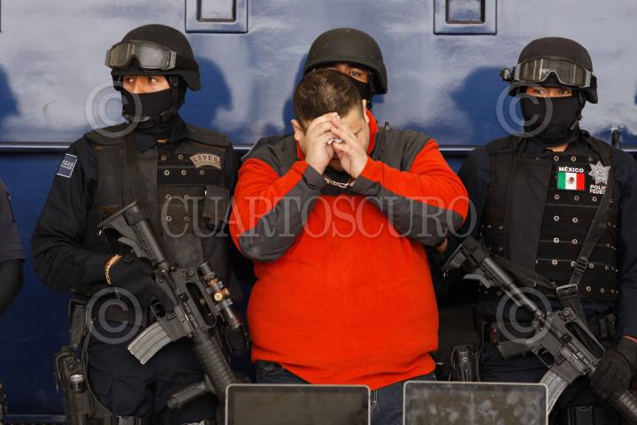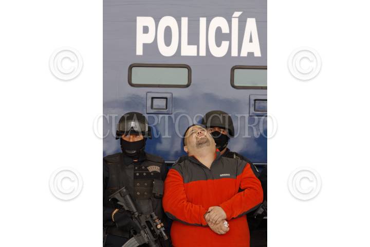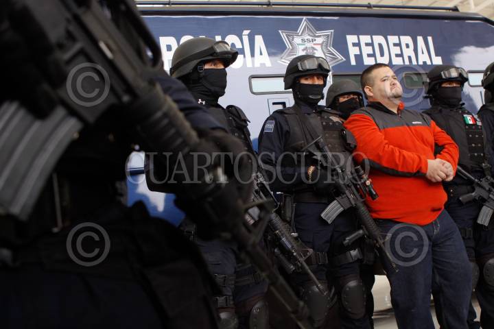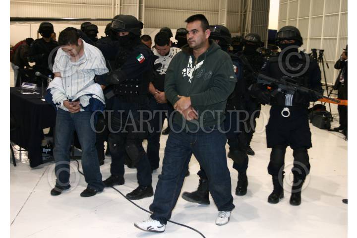 MÉXICO, D.F, 12ENERO2010.- Elementos de la Secretaria de Seguridad Pública, PGR y del Ejercito Mexicano presentaron ante los medios de comunicación a Eduardo Teodoro García Simental alias "El Teo" junto con Diego Raymundo Guerrero Gómez. La captura fue realizada en la colonia Las Flores en la Paz Baja California. Garcia Simental era uno de los sujetos más buscados por los gobiernos de México y Estados Unidos FOTO: SAÚL LÓPEZ/CUARTOSCURO.COM