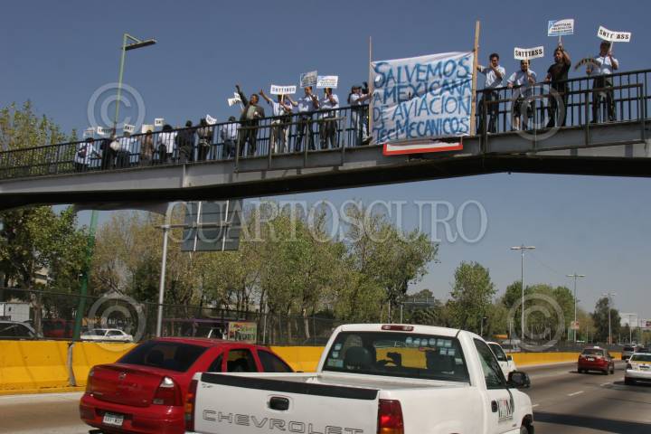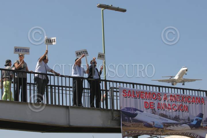 MÉXICO, D.F., 28OCTUBRE2010.- Integrantes del Sindicato Nacional de Trabajadores de Transportes, Transformación, Auxiliares, Servicios y Similares (SNTTTASS), se manifestaron en puentes peatonales aledaños al aeropuerto internacional Benito Juárez. FOTO: SAÚL LÓPEZ/CUARTOSCURO.COM