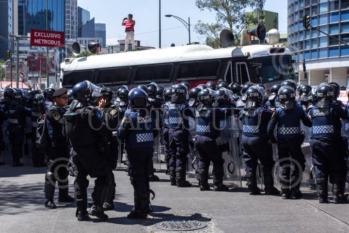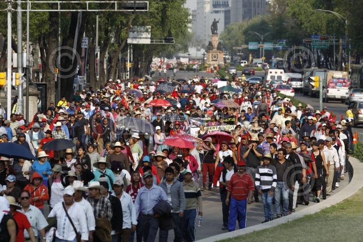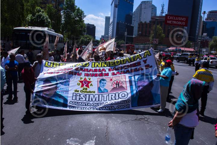 MÉXICO, D.F., 15ENERO2015.- Integrantes de la Unión Popular de Vendedores Ambulantes 28 de Octubre se movilizaron sobre avenida Reforma por la liberación de "Simitrio" Rubén Sarabia Sánchez líder de la 28 de Octubre, quien fue detenido tras ‘violar’ el acuerdo de preliberación al que estaba sujeto desde 2001 y tendría que cumplir en la cárcel una sentencia total de 51 años y medio. Simitrio, líder social de ambulantes, fue detenido por encabezar marchas y protestas en el estado de Puebla y había estado preso ya varios años por esta actividad, fue excarcelado tras un acuerdo en donde se le prohibía volver a encabezar manifestaciones o actos públicos en su estado. FOTO: MOISÉS PABLO /CUARTOSCURO.COM