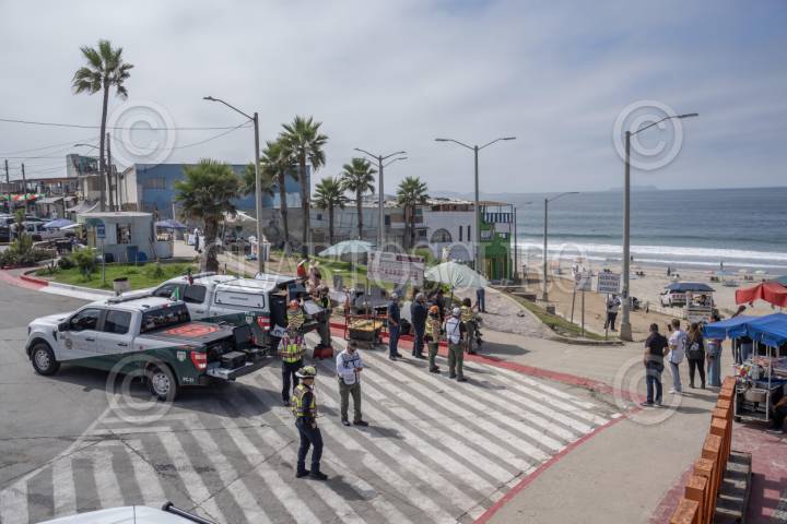 TIJUANA BAJA CALIFORNIA 19SEPTIEMBRE2025.-Unidades de Bomberos en Playas de Tijuana. Por primera vez se realizó un simulacro de tsunami en Playas de Tijuana, con la participación de 100 personas, así como elementos de Bomberos y Protección Civil Municipal. El ejercicio incluyó el cierre de vialidades desde el Faro y simuló un tsunami de magnitud 9.5 con epicentro en Hawái, lo que daría un margen de 30 minutos para evacuar. Personal de Protección Civil brindó información preventiva a los asistentes, en el marco de la conmemoración por los 40 años del sismo de 1985. FOTO OMAR MARTÍNEZ / CUARTOSCURO.COM