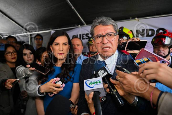 CIUDAD DE MÉXICO. 19SEPTIEMBRE2025.- Ricardo Monreal Ávila, coordinador de Morena junto con la presidenta de la mesa directiva de la cámara baja, Kenia López Rabadán;durante el simulacro de Sismo en el recinto de San Lázaro. FOTO: CUARTOSCURO.COM