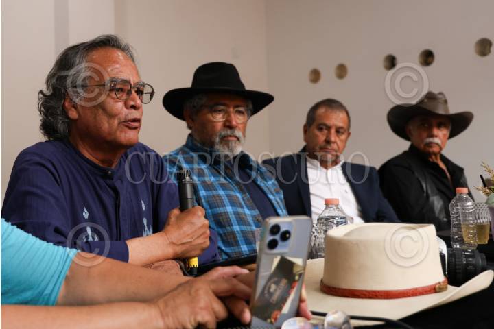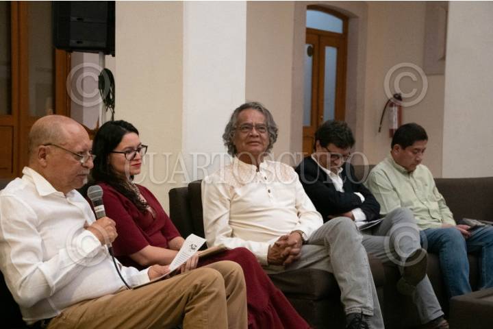GUADALAJARA, JALISCO, 26JUNIO2025.– Pedro Valtierra, director de la revista y agencia de fotografía Cuartoscuro, encabezó la presentación de su más reciente obra Sin miedo a la luz, en el marco de sus 50 años como fotoperiodista. El evento se llevó a cabo en el Museo de las Artes del Paraninfo Enrique Díaz de León de la Universidad de Guadalajara. En la mesa lo acompañaron, de izquierda a derecha, Ricardo Duarte, Diego Petersen, Pedro Mellado y Rafael del Río. FOTO: FERNANDO CARRANZA GARCÍA / CUARTOSCURO.COM