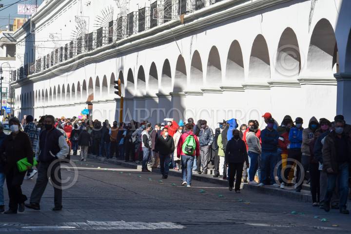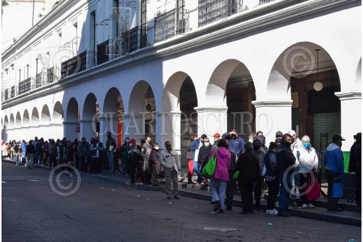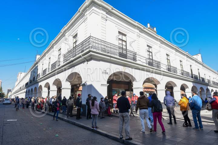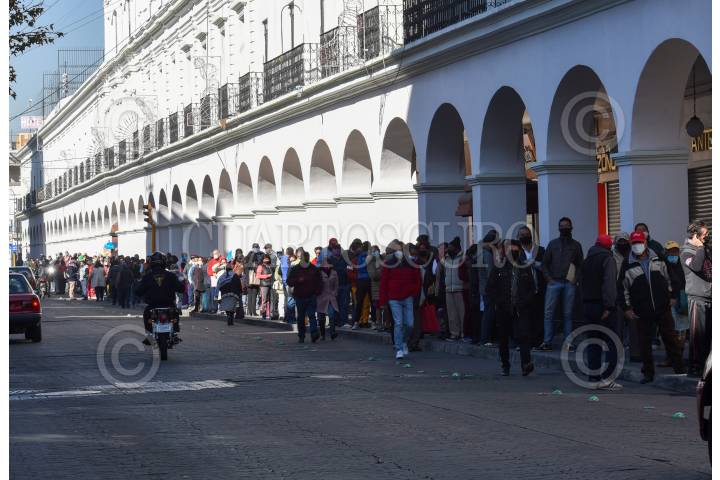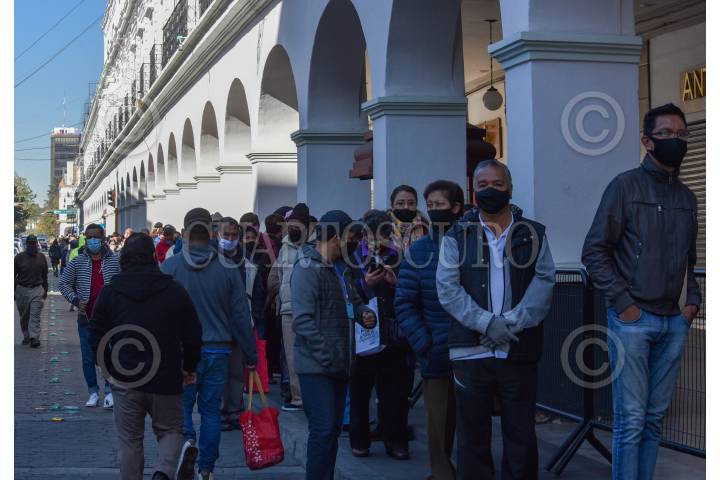 Una larga fila en los portales de Toluca de ciudadanos que acudieron a pagar el impuesto predial, sin conservar la sana distancia.