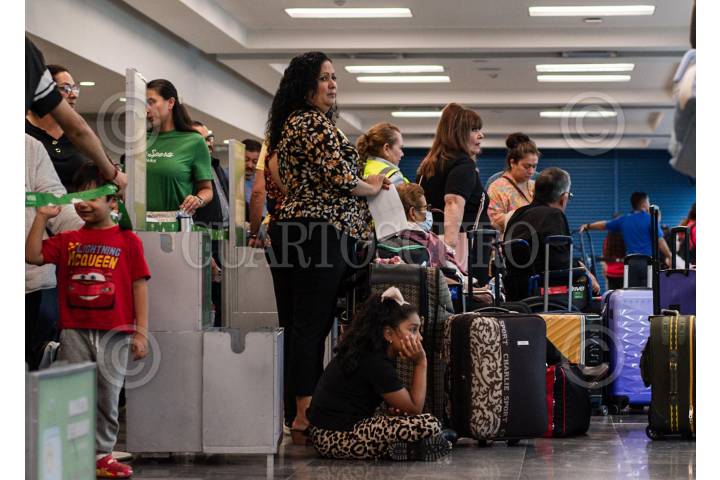 TIJUANA BAJA CALIFORNIA, 19JULIO2024 Personas en el aeropuerto de Tijuana desesperado tras la falla. Falla de Sistema Microsoft paraliza la frontera y los vuelos. A raíz de una falla operativa en el sistema de Windows Microsoft a nivel global que provocó la caída de miles de servidores en varias partes del mundo, incluyendo aeropuertos y cruces fronterizos. En Tijuana cientos de usuarios del Aeropuerto Internacional de Tijuana se quedaron varados hasta nuevo aviso y pese a que ya se solucionó la falla, el sistema continúa lento, causando la desesperación de los usuarios. La situación en la frontera más transitada del mundo, es la misma. Desde la noche del jueves 19 de julio, personas se quejaron de las largas filas que recorrían prácticamente toda la ciudad tras detenerse por completo el acceso hacia Estados Unidos. FOTO: OMAR MARTÍNEZ/CUARTOSCURO.COM