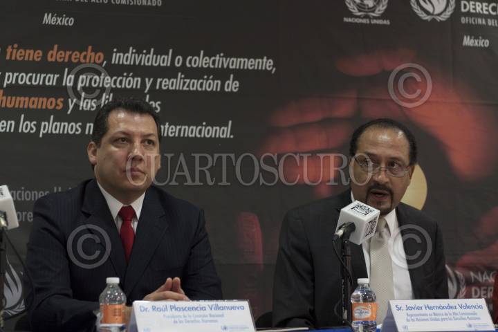 MÉXICO, D.F., 26JUNIO2013.- Raúl Plascencia Villanueva, presidente de la Comisión Nacional de Derechos Humanos y Javier Hernández Valencia, representante en México de la Alta Comisionada de las Naciones Unidas por los Derechos Humanos, durante la presentación sobre la situación de las y los defensores de derechos humanos en México presentado por la oficina del Alto Comisionado de la ONU, en Casa Lamm. FOTO: MOISÉS PABLO / CUARTOSCURO.COM
