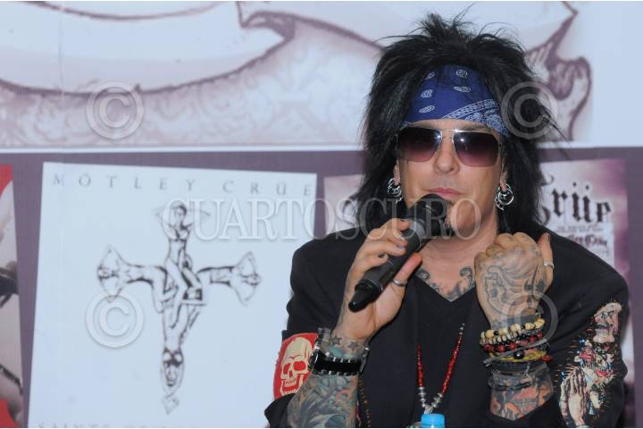 MÉXICO, D.F., 24MAYO2011.- El bajista, Nikki Sixx de la banda Mötley Crüe durante la conferencia de prensa que ofrecieron con motivo de su concierto en la ciudad de México. FOTO:FRANCISCO RODRIGUEZ/CUARTOSCURO.COM