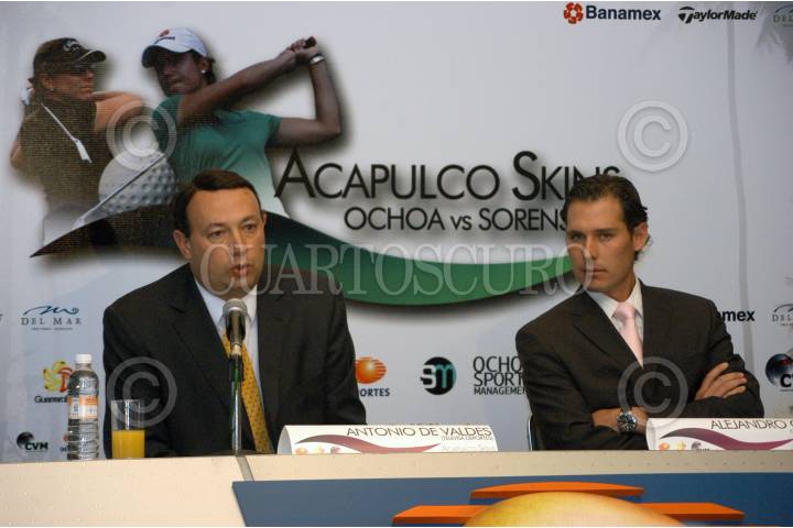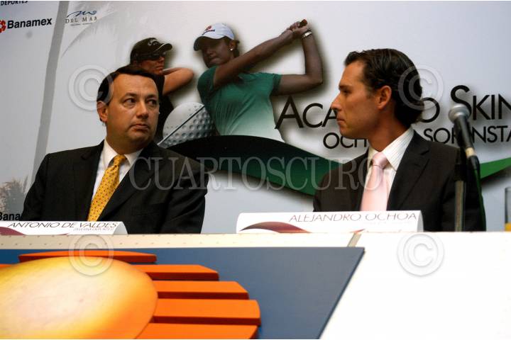 MÉXICO D.F. 30AGOSTO2006.- El cronista, Antonio de Valdes y Alejandro Ochoa, hermano de la golfista Lorena Ochoa, en conferencia de prensa dieron a conocer los pormenores del evento de golf internacional Acapulco Skins, que se realizara el proximo 16 de Septiembre en Tres Vidas, Acapulco. FOTO: Guillermo Perea/CUARTOSCURO.COM