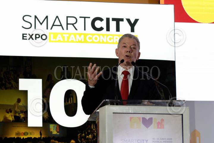 PUEBLA, PUEBLA, 10JUNIO2025.- Juan Manuel Santos, ex Presidente de Colombia, durante la inauguración del Smart City Expo Latam 2025; un evento internacional centrado en tecnología, inclusión y sostenibilidad, que se lleva a cabo en el Centro Expositor de la capital del estado de Puebla. FOTO: MIREYA NOVO/CUARTOSCURO.COM