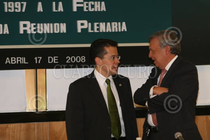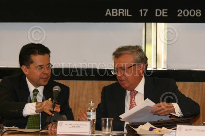 MÉXICO, D.F., 17ABRIL2008.-José Antonio Ceballos Soberanis, Director General de PEMEX Refinación acudió la Cámara de Diputados donde compareció ante la Comisión Investigadora de la Legalidad de los Contratos de PEMEX Refinación de 1997 a la Fecha.En la imagen es acompañado por el diputado Xavier López Adame, presidente de esta comisión. FOTO: GUILLERMO PEREA /CUARTOSCURO.COM