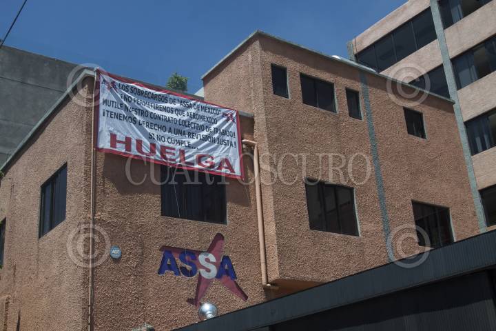 MÉXICO, D.F., 31MAYO2013.- En la sede de la Asociación Sindical de Sobrecargos de Aviación se colocó una manta en alusión a la posible huelga que estallará la media noche de hoy si no se concreta un acuerdo entre los trabajadores de esta asociación y la aerolínea Aeromexico. FOTO: RODOLFO ANGULO /CUARTOSCURO.COM