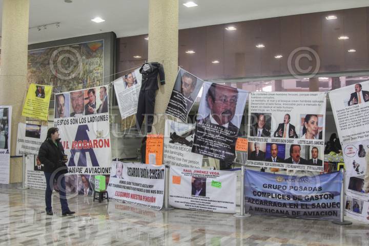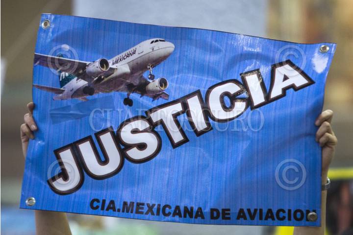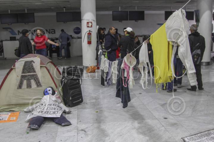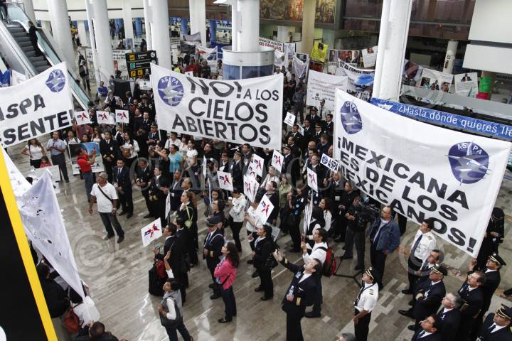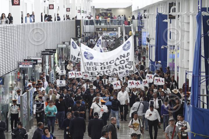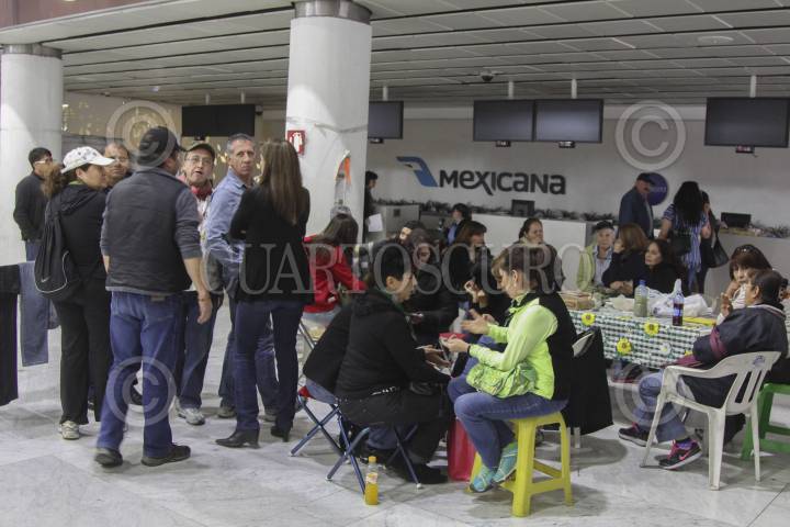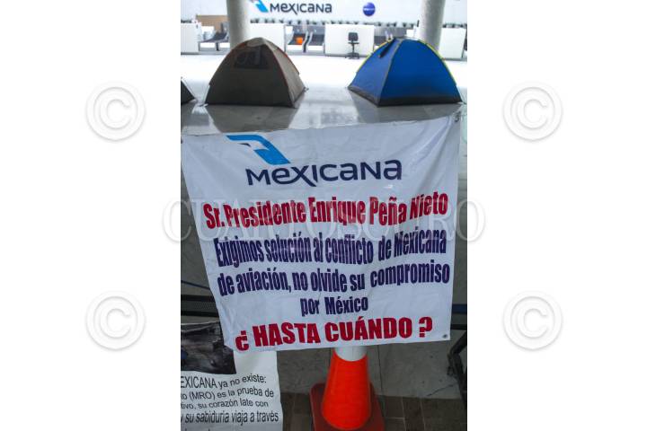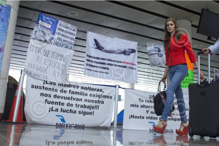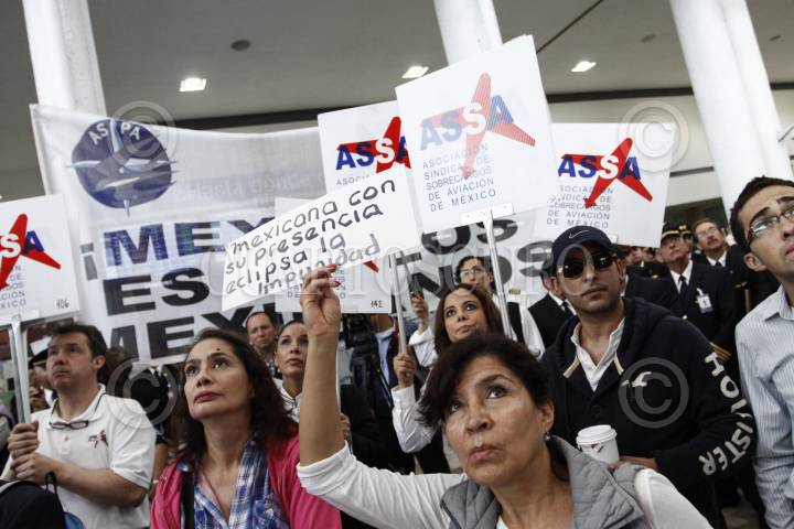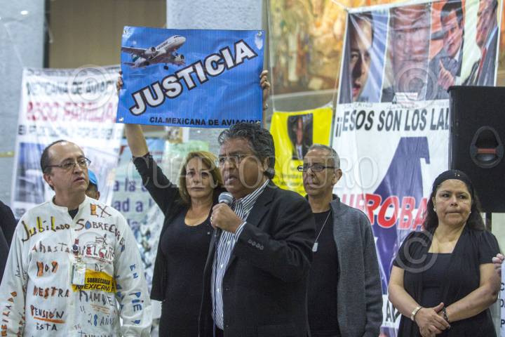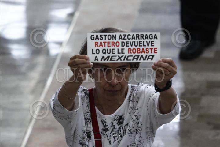 MÉXICO, D.F., 28AGOSTO2013.- Trabajadores de la desaparecida aerolínea, Mexicana, se manifestaron con un mitin en el Aeropuerto Internacional de la Ciudad de México exigiendo al gobierno federal se realice el rescate de la empresa. FOTO: ENRIQUE ORDÓÑEZ /CUARTOSCURO.COM