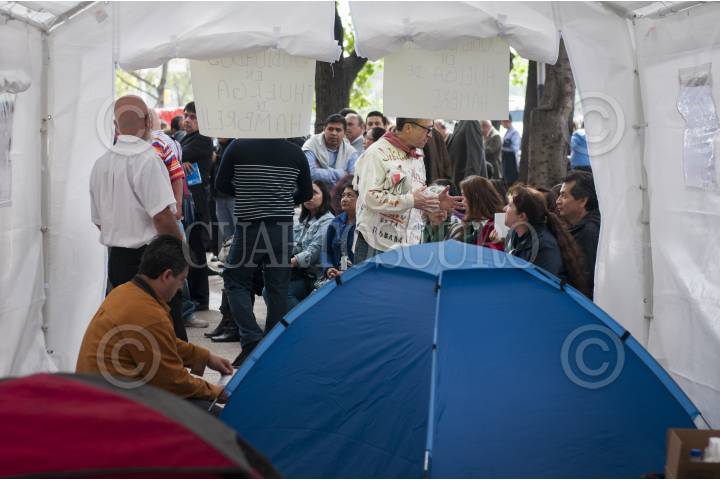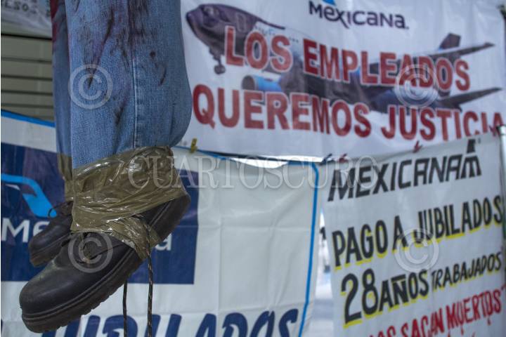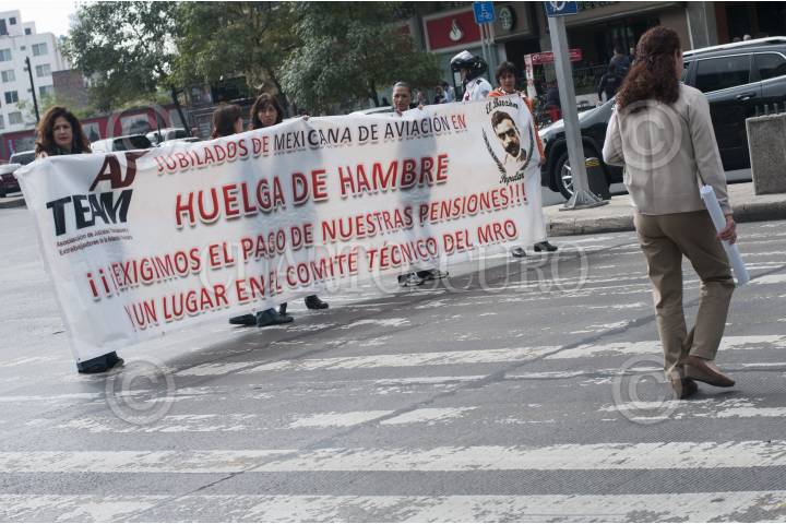 MÉXICO, D.F., 13AGOSTO2014.- Alrededor de 60 ex trabajadores y jubilados de Mexicana de Aviación instalaron un plantón permanente frente a la Secretaría del Trabajo y Previsión Social, sobre pase de la Reforma, para exigir el pago de sus pensiones. Dos trabajadores iniciaron una huelga de hambre indefinida hasta que se logre un acuerdo con las autoridades correspondientes. FOTO: DIEGO SIMÓN SÁNCHEZ /CUARTOSCURO.COM