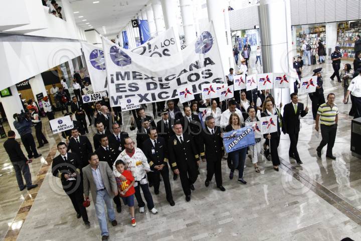 MÉXICO, D.F., 15ABRIL2014.- Integrantes de los sindicatos de pilotos, sobrecargos y personal de tierra, jubilados y trabajadores de confianza protestaron y realizaron una marcha dentro de la Terminal 1 del Aeropuerto Internacional de la Ciudad de México contra la quiebra de la aerolínea Mexicana de Aviación. FOTO: RODOLFO ANGULO /CUARTOSCURO.COM