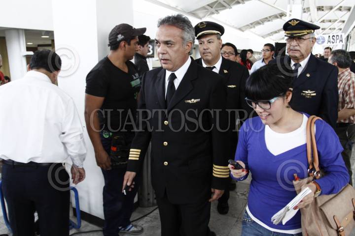 MÉXICO, D.F., 15ABRIL2014.- Carlos Manuel Díaz Chavez, lider de la Asociación Sindical de Pilotos de Aviación durante la protesta dentro de la Terminal 1 del Aeropuerto Internacional de la Ciudad de México contra la quiebra de la aerolínea Mexicana de Aviación. FOTO: RODOLFO ANGULO /CUARTOSCURO.COM