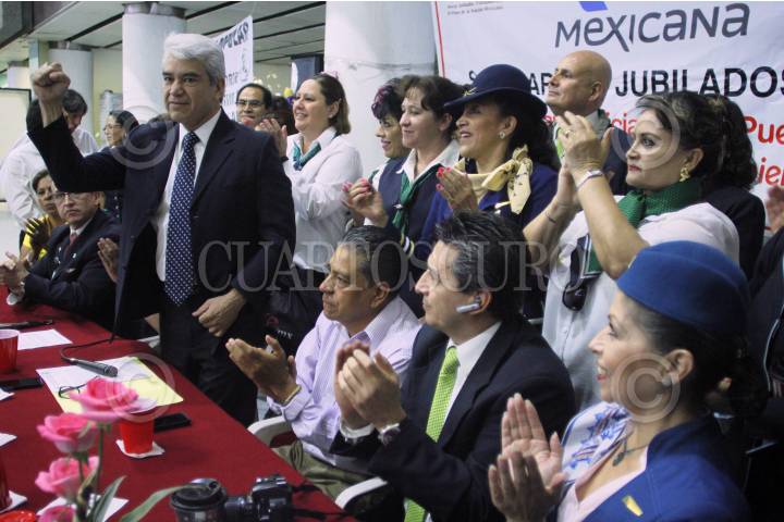 MÉXICO, D.F., 27JULIO2014.- Jubilados de Mexicana de Aciacion, realizaron un posicionamiento en la Terminal 1 del Aeropuerto internacional de la Ciudad de México a demás de realizar un reconocimiento a Crecencio Morales, líder del Barzón Popular. FOTO: ENRIQUE ORDÓÑEZ /CUARTOSCURO.COM