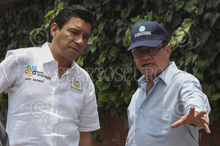 MÉXICO, D.F., 22MAYO2014.- Jesus Valencia delegado en Iztalapa y Miguel Ricaño Escobar, director del Sistema de Aguas de la Ciudad de México, mencionaron que al menos una semana de trabajos tardaran en reparar el que un tubo de 20 pulgadas de diámetro de la red primaria de agua potable que provocó un socavón de 25 metros de largo por 8 de ancho y 12 metros de profundidad, ubicado en la calle Águila Blanquinegra esquina con Jacobo Watts, colonia Pueblo de San Simón Culhuacán. FOTO: SAÚL LÓPEZ /CUARTOSCURO.COM