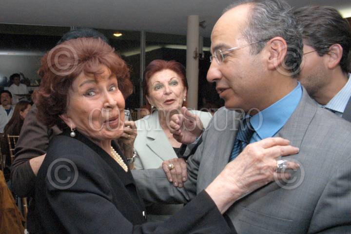 MÉXICO D.F. 19 ABRIL 2006.- El candidato del PAN, a la presidencia, Felipe Calderón y Paloma Gómez, viuda de José Alfredo Jiménez, durante su reunión con miembros de la Sociadad de Autores y Compositores de Musica, como un acto de camapaña para las proximas elecciones. FOTO: Guillermo Perea / CUARTOSCURO.COM