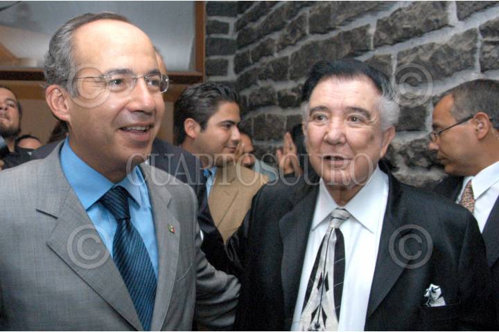 MÉXICO D.F. 19 ABRIL 2006.- El candidato del PAN, a la presidencia, Felipe Calderón y el compositor, Roberto Cantoral, durante su reunión con miembros de la Sociadad de Autores y Compositores de Musica, como un acto de camapaña para las proximas elecciones. FOTO: Guillermo Perea / CUARTOSCURO.COM