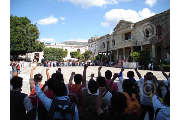 CHILPANCINGO, GUERRERO., 07DICIEMBRE2007.- Estudiantes y egresados de la normal rural de Ayotzinapa acompañados de padres de familia y estudiantes de varias normales rurales del pais pertenecientes a la Federacion de Estudiantes Campesinos Socialistas de Mexico (FECSM) realizaron una marcha para protestar contra el desalojo violento sufrido a manos de la PFP de la caseta de La Venta en la Autopista del Sol, asi mismo para exigir la entrega de plazas para maestros rurales, la destitucion del titular de la SEG Jose Luis Gonzalez de la Vega Otero y una nueva audiencia de caracter resolutivo con el gobernador del estado Zeferino Torreblanca Galindo. FOTO: OSCAR ALVARADO/CUARTOSCURO.COM