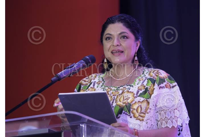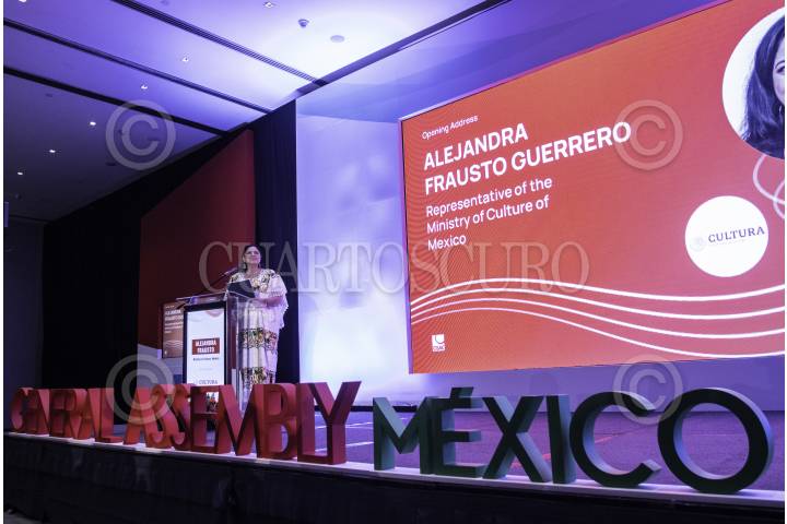 Alejandra Frausto, secretaria de Cultura durante La Asamblea General de la Confederación Internacional de Sociedades de Autores y Compositores que se llevo a cabo en un hotel ubicado en Avenida Reforma.