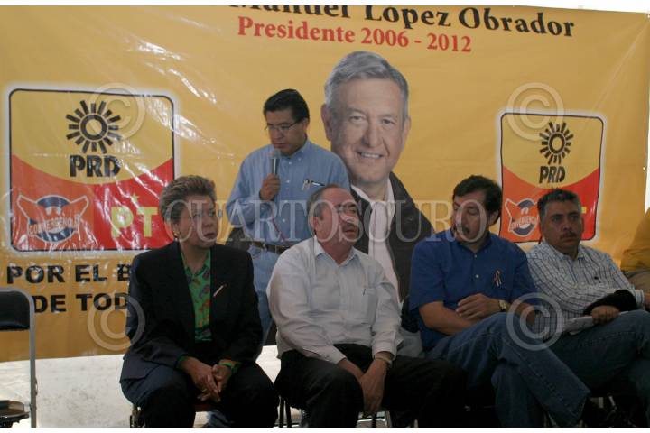 MEXICO, D.F. 28AGOSTO2006.- Horacio Duarte, Socorro Díaz, Leonel Cota Montaño, presidente nacional del PRD, Gerardo Fernandez Noroña y Guadalupe Acosta durante la conferencia que ofrecieron a los medios de comunicación en una carpa del plantón en el zócalo. FOTO: Nelly Salas/CUARTOSCURO.COM