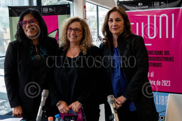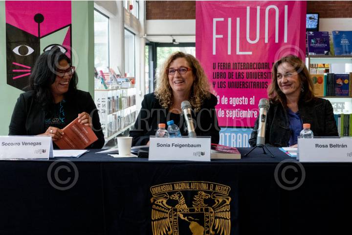 Socorro Venegas, Sonia Feigenbaum y Rosa Beltrán durante la conferencia de prensa de la edición 2023 de la FILUNI.