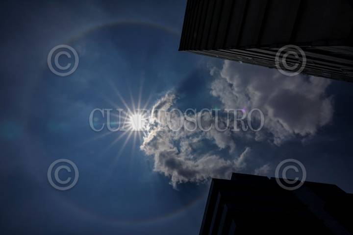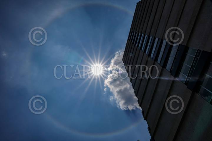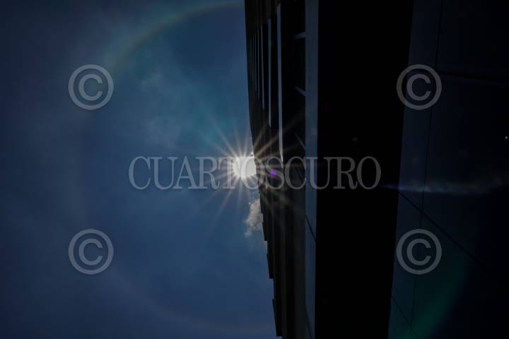 CIUDAD DE MÉXICO, 24MAYO2025.- Un halo solar (fenómeno causado por partículas de hielo en suspensión en la troposfera que refractan la luz generando un espectro de colores alrededor del Sol) fue apreciado desde diversos puntos de la capital del país. FOTO: GALO CAÑAS/CUARTOSCURO.COM