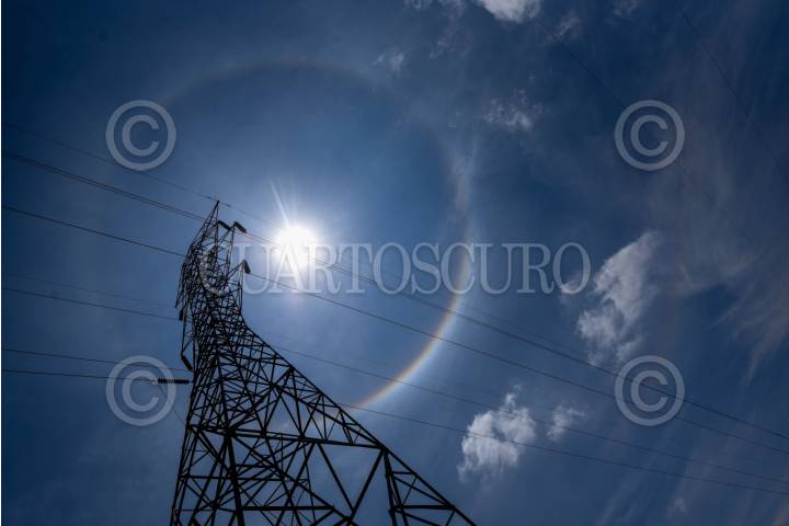 TOLUCA, ESTADO DE MÉXICO, 10 JULIO 2025.- En la capital mexiquense se pudo observar un halo solar, un fenómeno óptico, formando un anillo de luz alrededor del sol con colores similares al del arcoíris. Se registra por la refracción de luz solar a través de cristales de hielo en las nubes. FOTO: CRISANTA ESPINOSA AGUILAR/CUARTOSCURO.COM