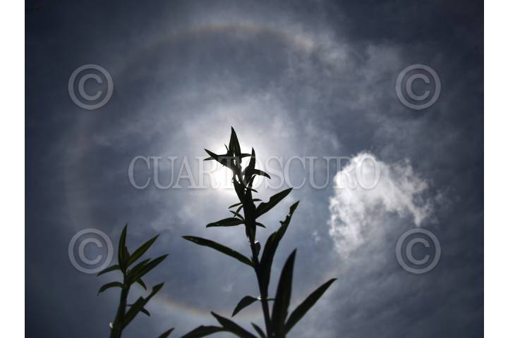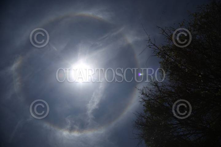Un halo solar se observa en el cielo. Este fenómeno meteorológico se produce por partículas de hielo en suspensión en la troposfera que refractan la luz generando un espectro de colores alrededor del sol o la luna