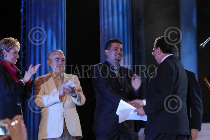 Mazatlán, Sinaloa 21Febrero 2004.- Durante la coronación de la reina de loos juegos florales del Carnaval de Mazatlán, los escritores Ignacio Solares y Juan Jose Rodriguez ( centro) reciberon el premio Mazatlán de literatura. FOTO: Germán Romero/CUARTOSCURO.COM