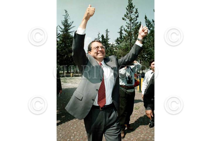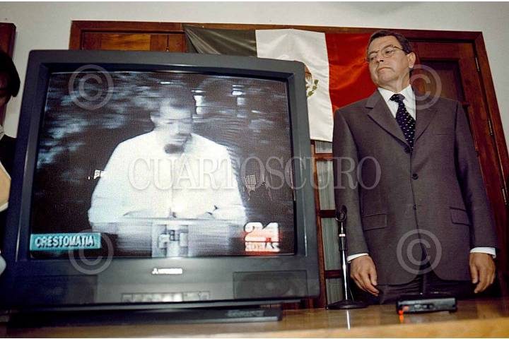 MÉXICO, D.F., 05JUNIO2015.- El senador Manuel Camacho Solís, murió esta madrugada se sabe que padecía de cáncer cerebral desde hacía un año, el político nació en la ciudad de México el 30 de marzo de 1946, de formación priista fue egresado de la Facultad de Economía de la UNAM. Camacho Solís fue elegido por el presidente Carlos Salinas de Gortari como comisionado para la paz durante el levantamiento armado del EZLN en el año de 1994, Regente de la Ciudad y candidato a la presidencia por el Partido del Centro Democrático. En la imagen el entonces candidato del Partido de Centro Democrático (PCD) presento un vídeo de una conferencia en la que Luis Donaldo Colosio manifiesta su entera simpatía por Camacho Solís lo que a decir del candidato lo exonera de cualquier responsabilidad del crimen de Lomas Taurinas, imagen del 22 de marzo del 2000. FOTO: ARCHIVO/ INTI VARGAS /CUARTOSCURO