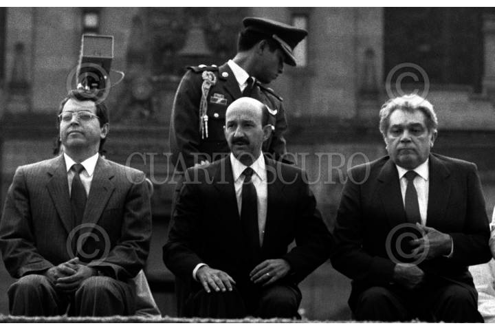 MÉXICO, D.F., 05JUNIO2015.- El senador Manuel Camacho Solís, murió esta madrugada se sabe que padecía de cáncer cerebral desde hacía un año, el político nació en la ciudad de México el 30 de marzo de 1946, de formación priista fue egresado de la Facultad de Economía de la UNAM. Camacho Solís fue elegido por el presidente Carlos Salinas de Gortari como comisionado para la paz durante el levantamiento armado del EZLN en el año de 1994, Regente de la Ciudad y candidato a la presidencia por el Partido del Centro Democrático. En la imagen Camacho Solís, el ex Presidente Carlos Salinas de Gortari y ex gobernador de Yucatán, Víctor Cervera Pacheco, el 5 de Agosto de 1990. FOTO: ARCHIVO/ ELOY VALTIERRA /CUARTOSCURO.COM