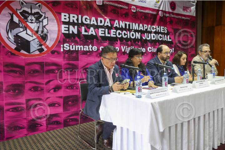 CIUDAD DE MÉXICO, 26MAYO2025.- Amado Avendaño Villafuerte, Mariana Vega, Emilio Álvarez Icaza Longoria, Mariana González Torres, y Rodrigo Morales Manzanares, que forma parte de la organización Somos México presentaron la Brigada Antimapaches en la Elección Judicial, en la que realizaron un llamado a la ciudadanía para sumarse y participar como observadores en jornada electoral del próximo domingo y evitar cualquier irregularidad, esto a pesar de que no están de acuerdo con el proceso, al señalarlo que solo busca debilitar al Poder Judicial. El encuentro con medios se llevo a cabo en un hotel de Reforma, en donde también rechazaron cualquier entendimiento con la CNTE, ya que por la mañana la Presidenta de México, que ahora los maestros se están sumando a boicotear la elección, cosa que más tarde los profesores desmintieron. FOTO: MOISÉS PABLO/CUARTOSCURO.COM