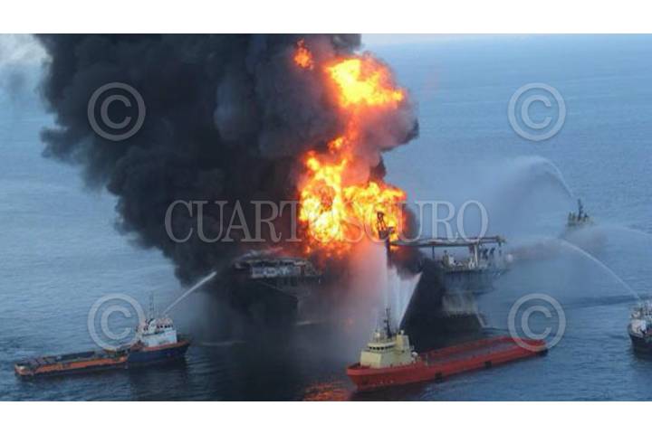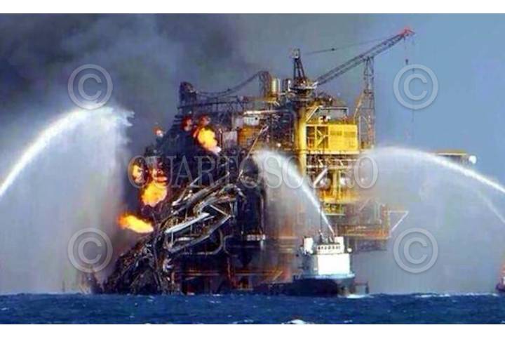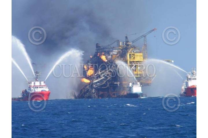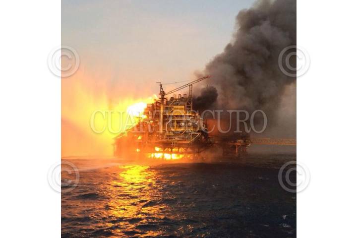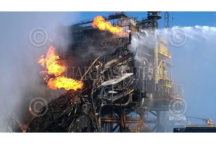 PLATAFORMA ABKATUN, SONDA DE CAMPECHE, 01ABRIL2015.- La madrugada de este miércoles se registro un incendio en la plataforma Abkatun A-Permanente ubicada en la Sonda de Campeche en el Golfo de México en donde PEMEX confirma 4 muertos y se registran al menos 16 trabajadores lesionados. El incendio se registró en el área de deshidratación y bombeo y se desalojaron aproximadamente 300 trabajadores a otras plataformas. FOTO: EMH /CUARTOSCURO.COM