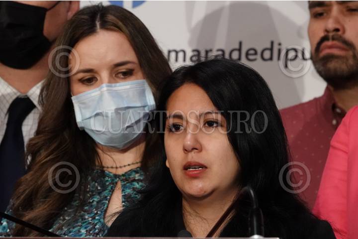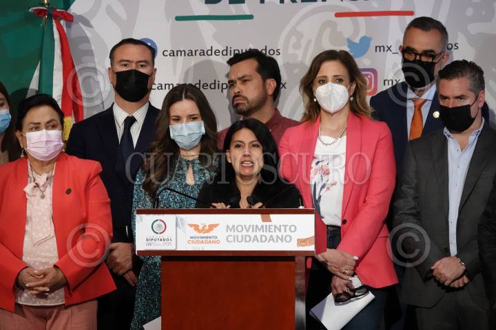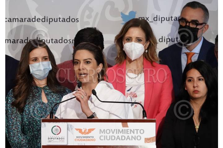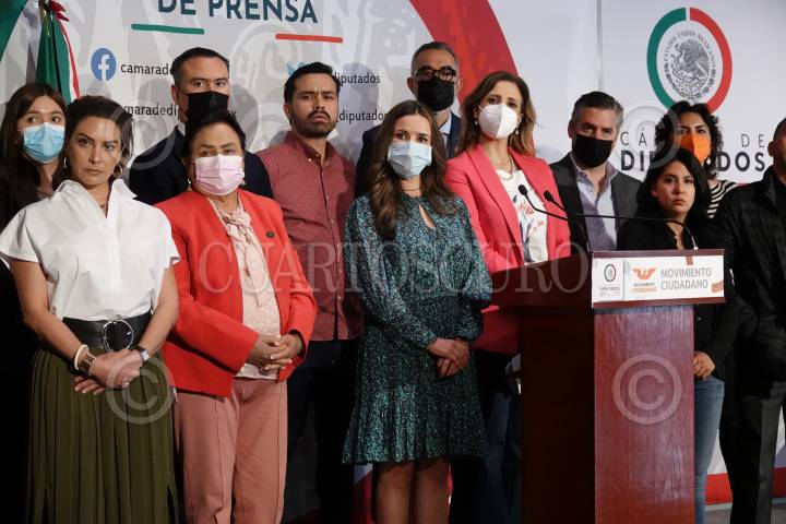 Mirza Flores, Ana Katiria Flores, Sonia López, e integrantes de la bancada de Movimiento Naranja, durante la conferencia de la llamada Ley Fátima.